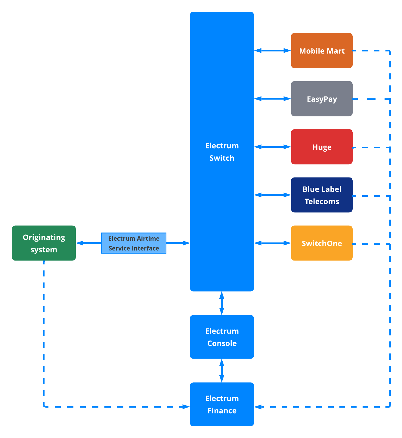 The figure below depicts the high-level architecture of the Electrum Direct Top-Up Airtime Service. The originating system – which could be a digital channel, ATM, or an in-store point of sale – communicates with the Electrum Switch via the Electrum Airtime Service Interface. The Electrum Switch in turn connects to multiple service providers, and optionally one or more payment providers. Electrum Finance supports transaction matching, reconciliation, and financial reporting, and the Electrum Console is the system's user interface which provides tools for transaction lookup, configuration, reporting, and the aforementioned back-office functions.
