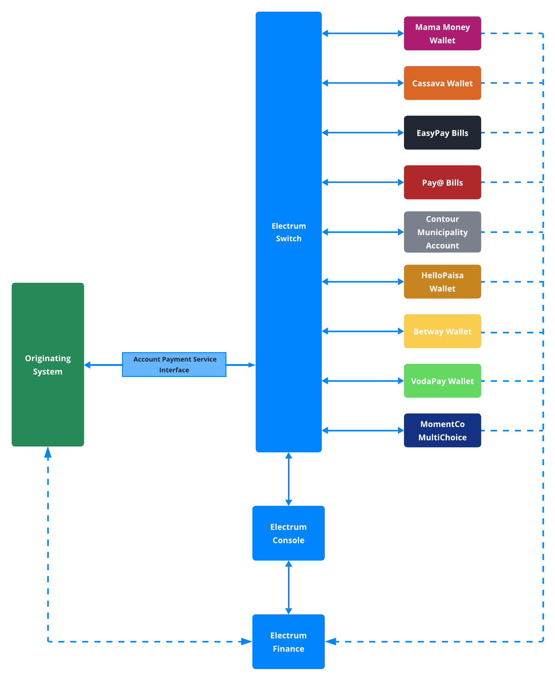 The figure below depicts the high-level architecture of the Account Payment Service Interface. The originating system – which could be a digital channel, or an in-store point of sale – communicates with the Electrum Switch via the Account Payments Service Interface. The Electrum Switch in turn connects to multiple service providers. Electrum Finance supports transaction matching, reconciliation, and financial reporting, while the Electrum Console is the system's user interface which provides tools for transaction lookup, configuration, reporting, and back-office functions.