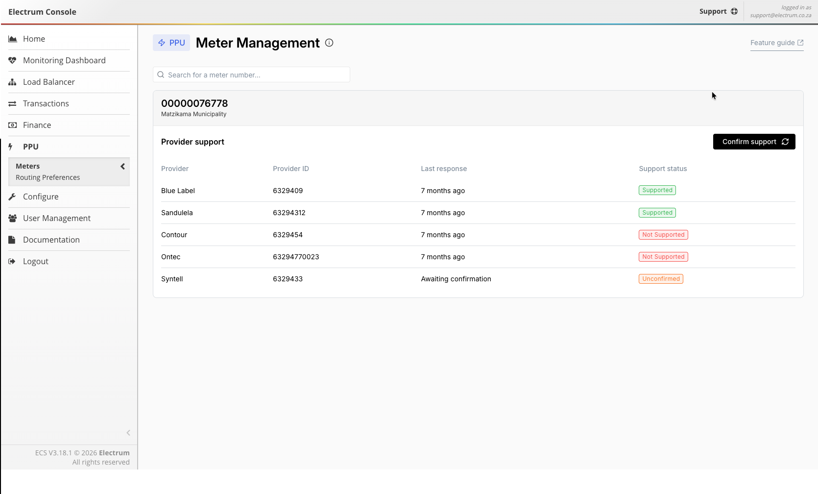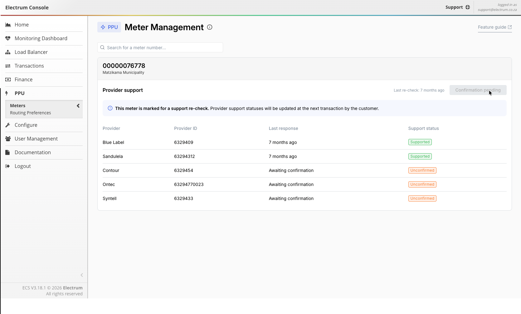 The next time the consumer wants to purchase an electricity token for their meter, the system identifies that the meter has been marked for support confirmation and sends a meter lookup to all providers.