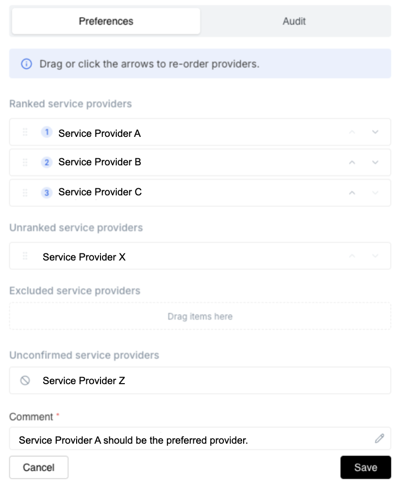 Drag and drop the service providers, or use the up and down arrows, to change the rankings and/or statuses of your service providers. You can: