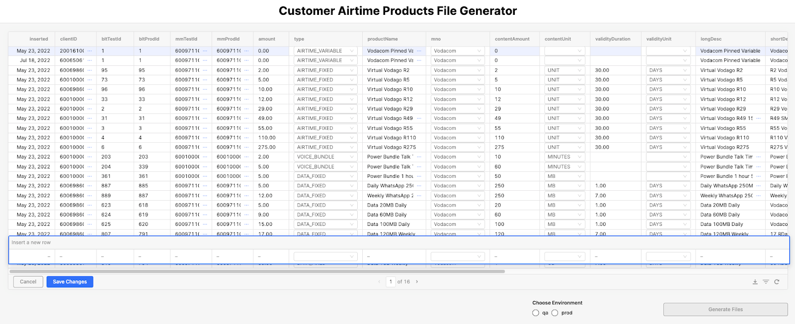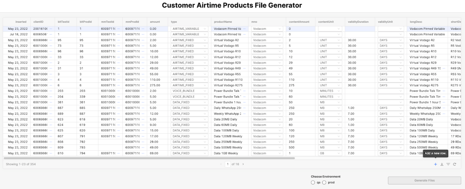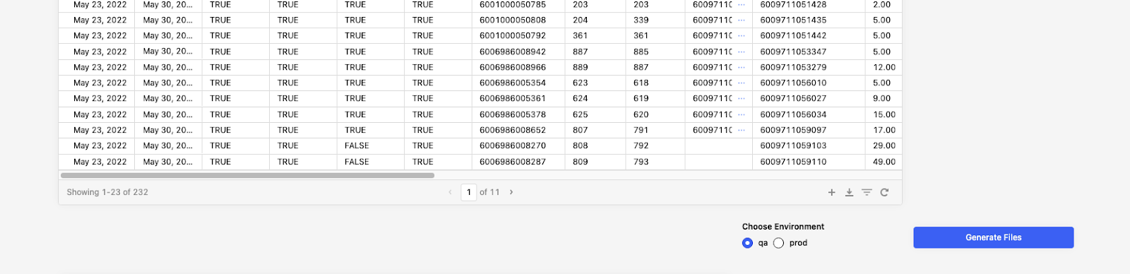 Retool displays environments such as QA and Production, and you can select to generate files for these environments; otherwise, it will generate an empty JSON file. For example, all products marked as TRUE in the QA column will be included in the generated JSON files.