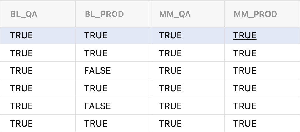 In the screenshot below, the first two characters indicate the specific service provider (e.g., "BL" for Blue Label, "MM" for Mobile Mart). Everything after the underscore shows the environment represented by the column: